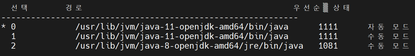 이후 설치한 버전을 java 버전으로 숫자를 입력하여 선택하고, 선택한 버전이 맞는지 확인한다.