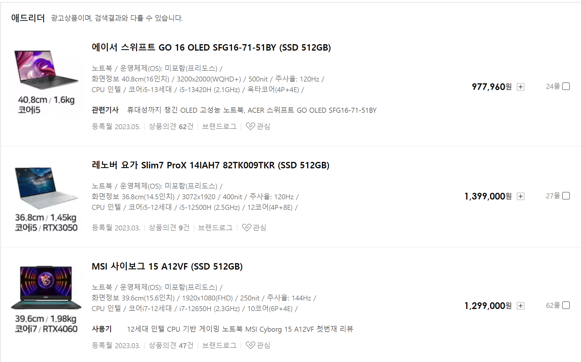 여러 제품의 사양을 비교하면서 구매할 때 비교 사이트를 참고하는 게 좋아, 다나와 노트북 사이트를 활용했습니다. 외장 그래픽 카드의 경우, 최근에 출시한 RTX4050이 전성비가 좋다 해서 선택했습니다.
